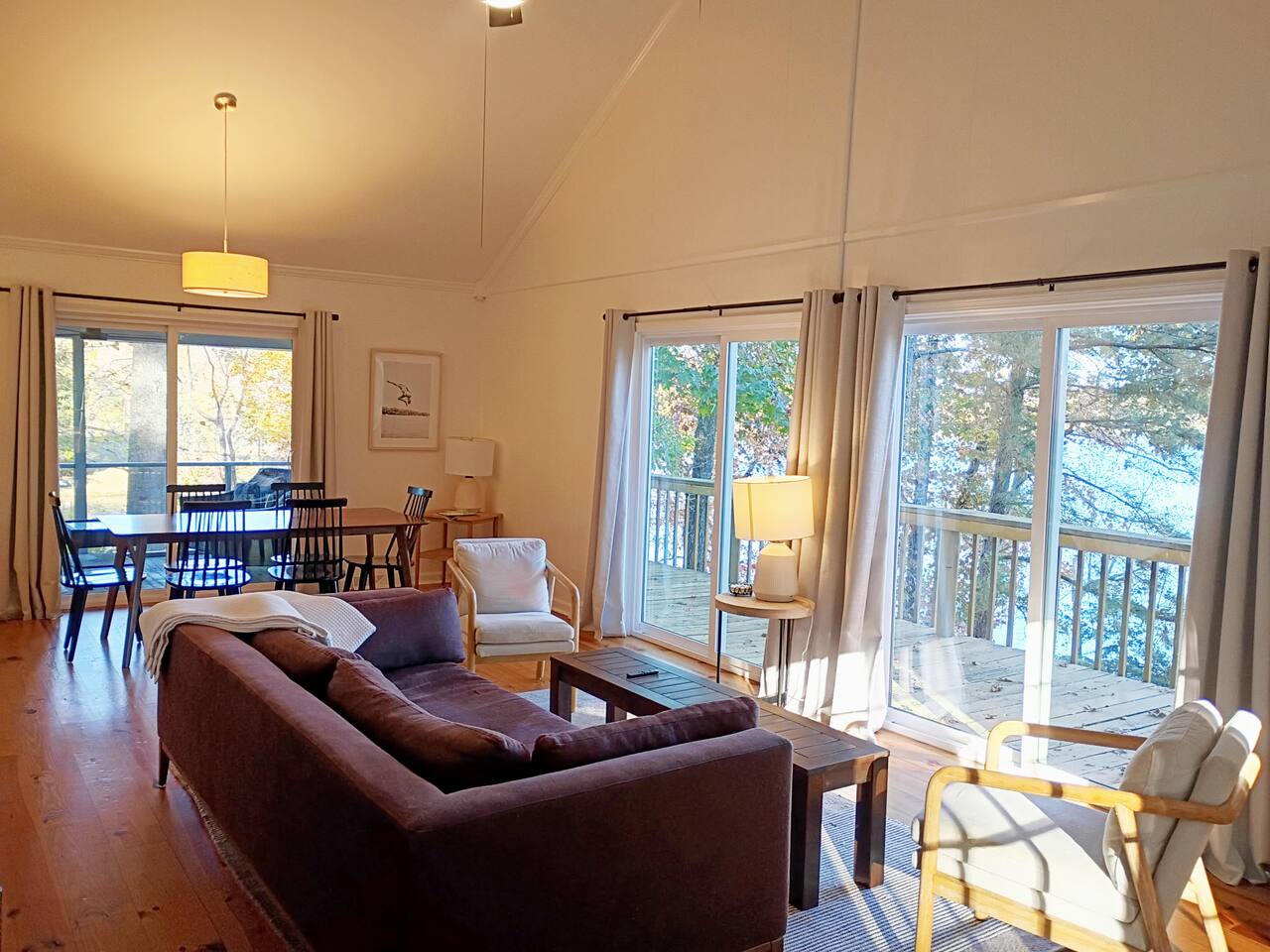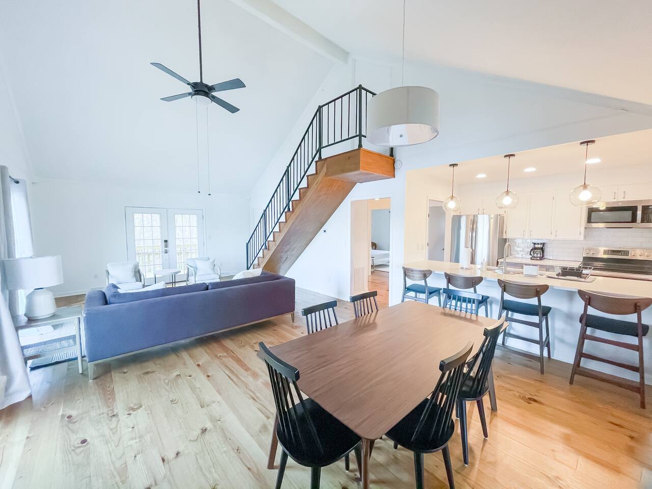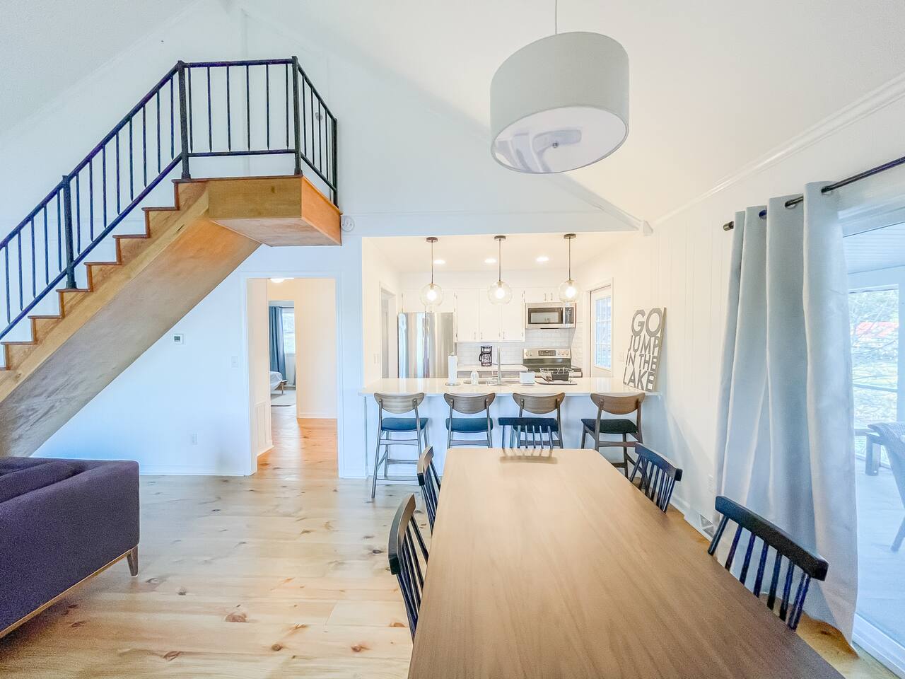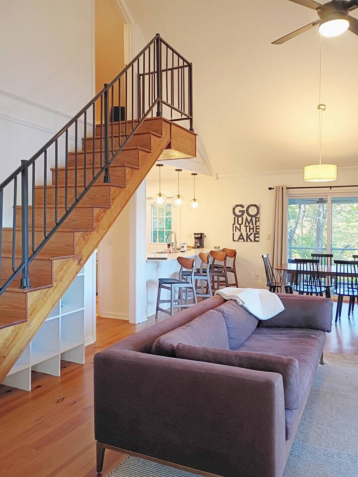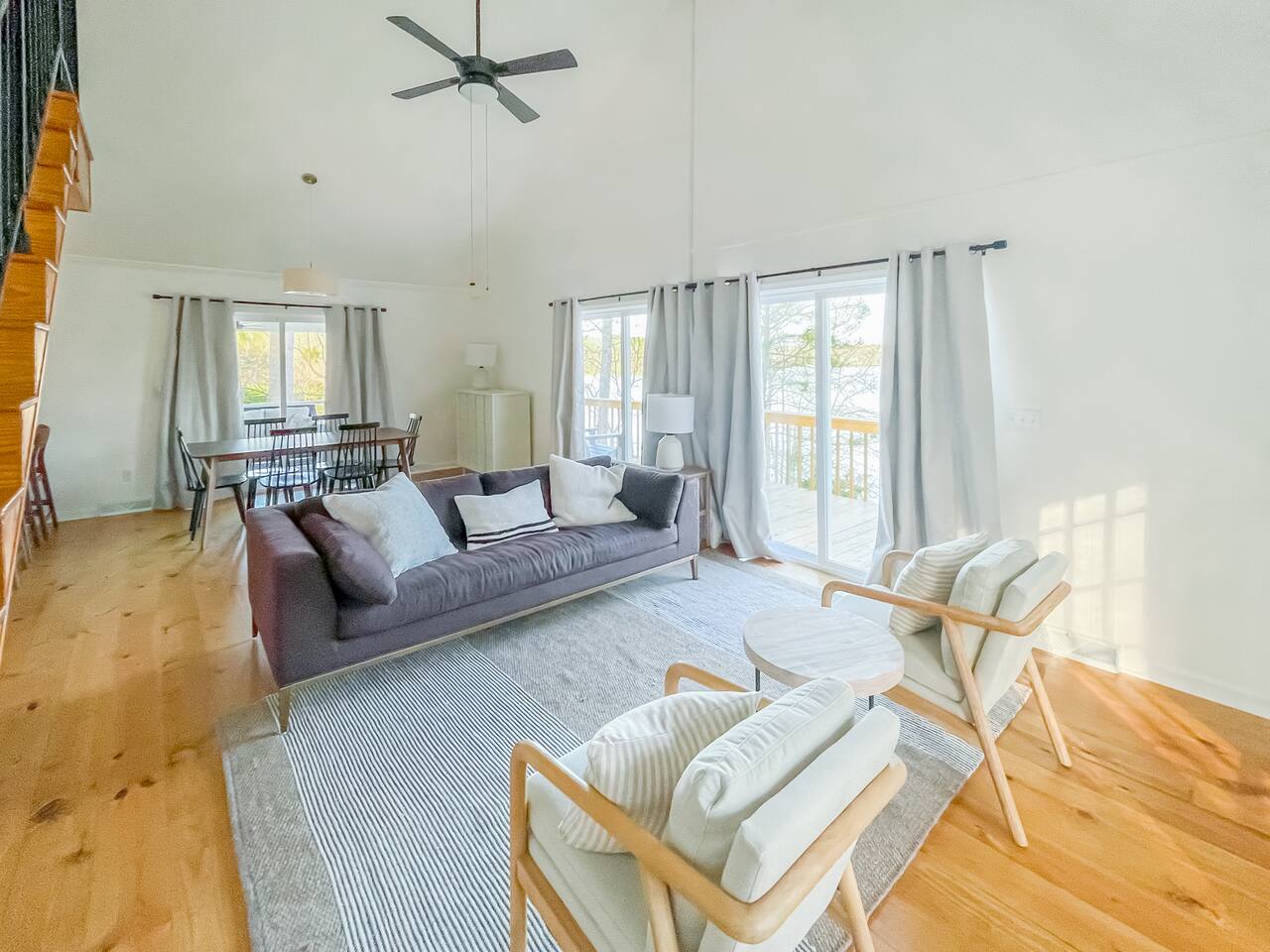 Feel at home with high ceilings and open kitchen/dining/living space overlooking beautiful views of the water. The home has first floor bedrooms with queen beds. A staircase leads to a loft space with two twin beds and a pull-out full bed. Take in the view from Adirondacks on the deck or sit in the shade of a screened-in porch off the kitchen.