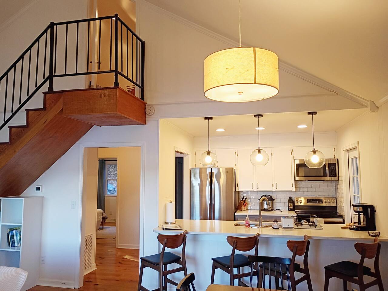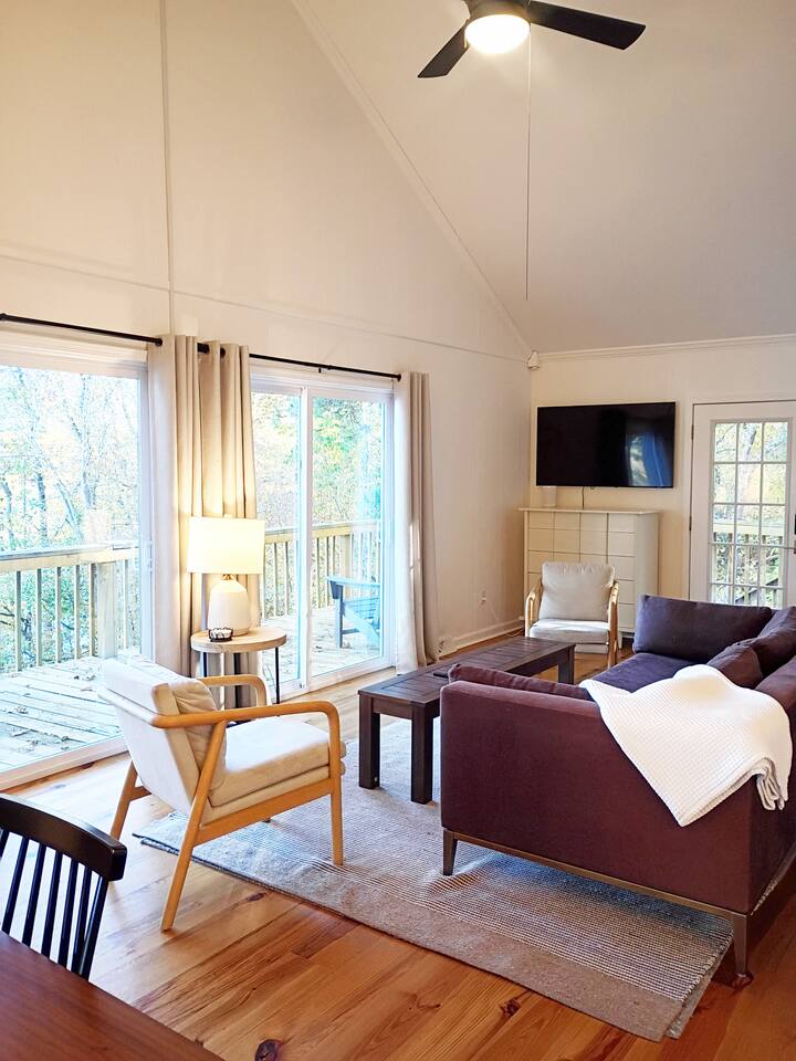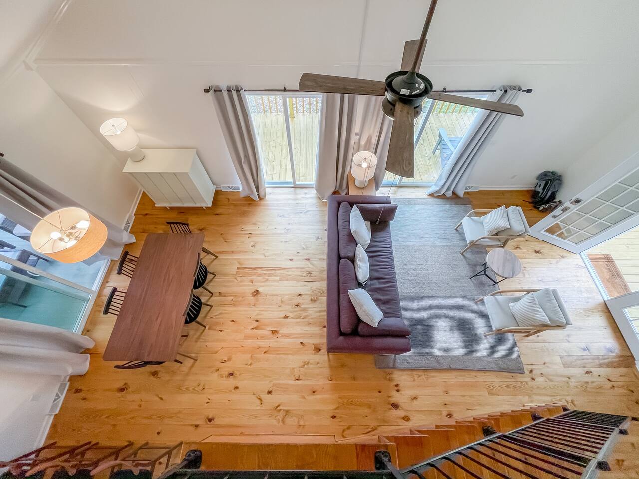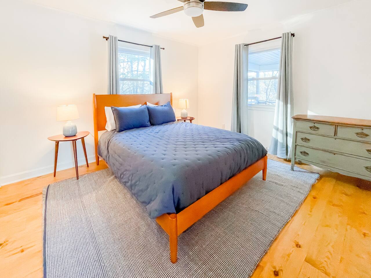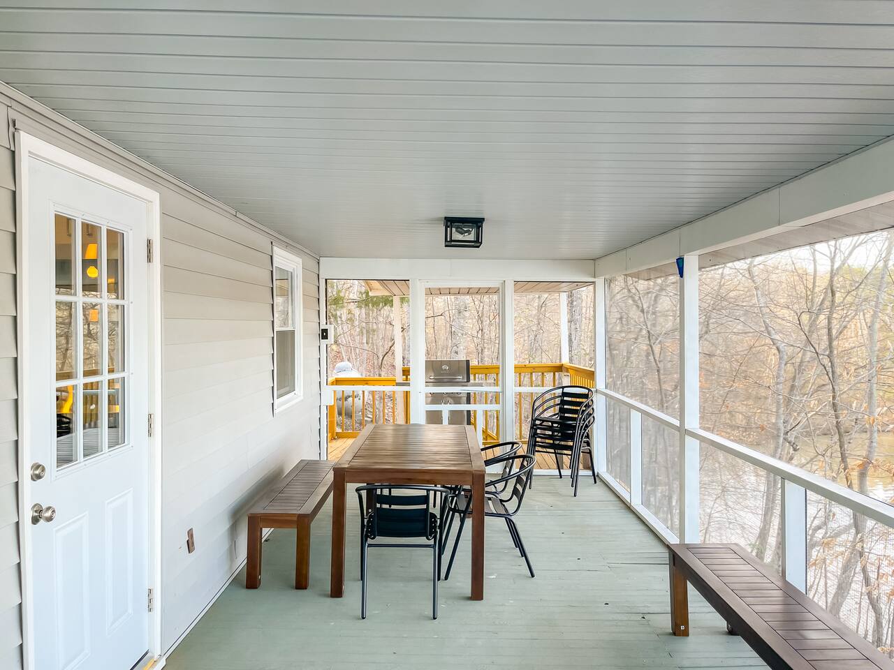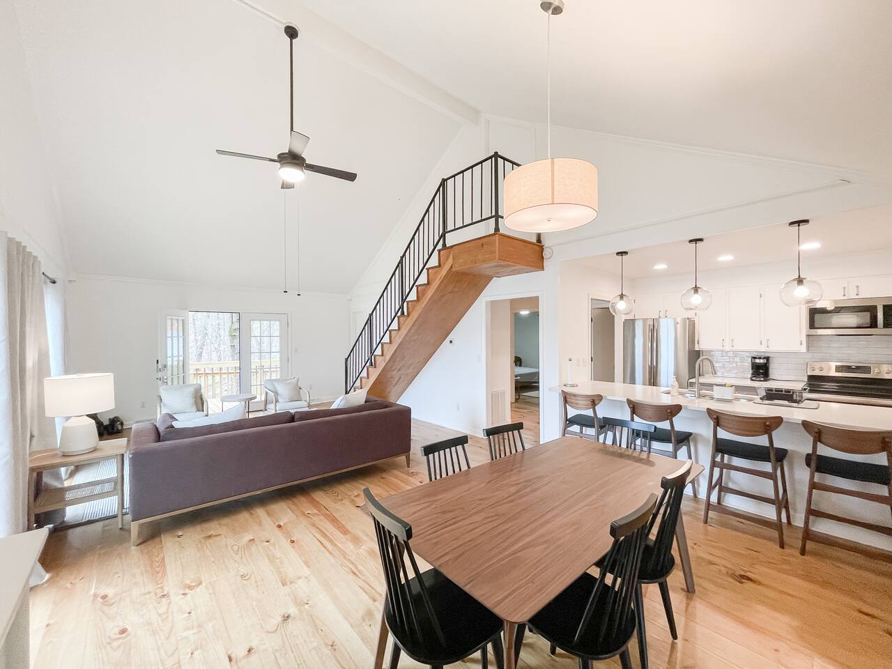 Feel at home with high ceilings and open kitchen/dining/living space overlooking beautiful views of the water. The home has first floor bedrooms with queen beds. A staircase leads to a loft space with two twin beds and a pull-out full bed. Take in the view from Adirondacks on the deck or sit in the shade of a screened-in porch off the kitchen.