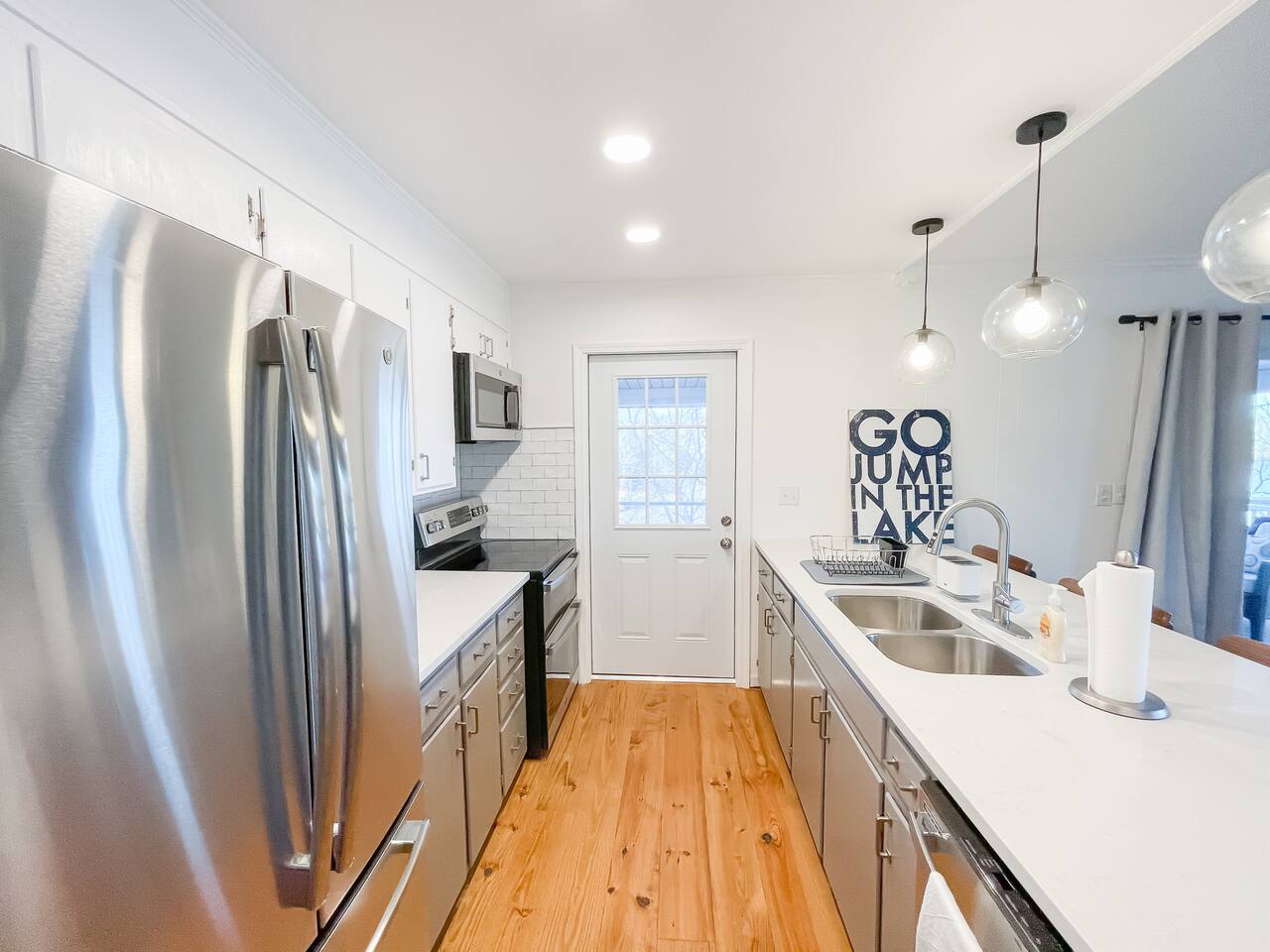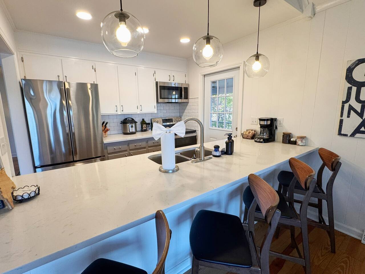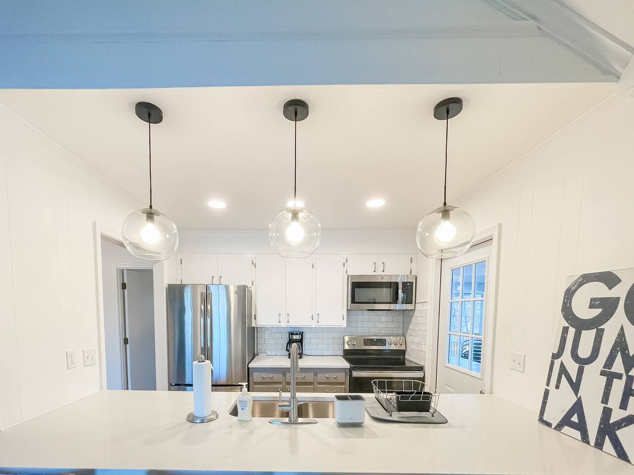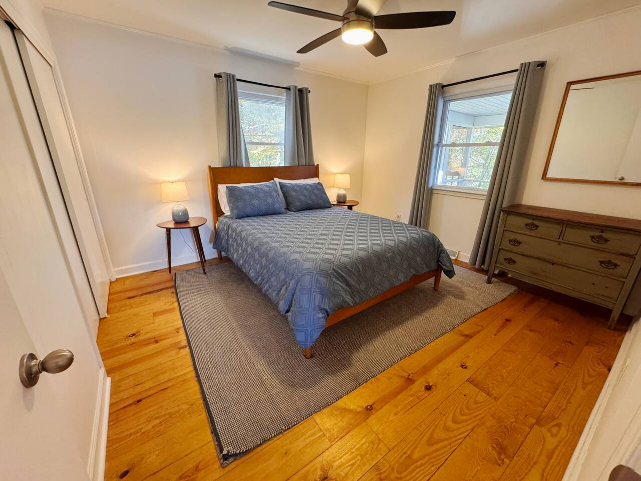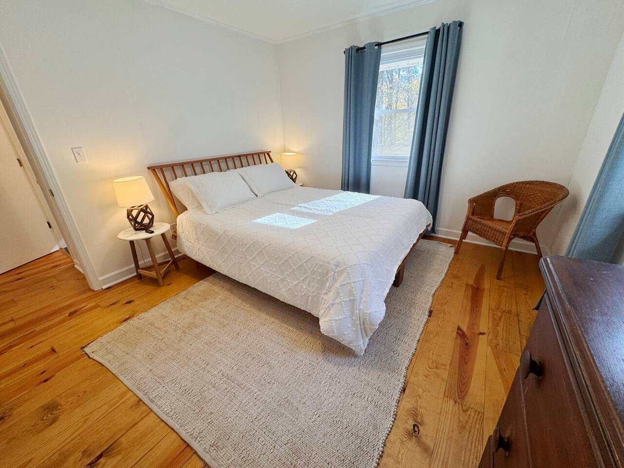 Feel at home with high ceilings and open kitchen/dining/living space overlooking beautiful views of the water. The home has first floor bedrooms with queen beds. A staircase leads to a loft space with two twin beds and a pull-out full bed. Take in the view from Adirondacks on the deck or sit in the shade of a screened-in porch off the kitchen.