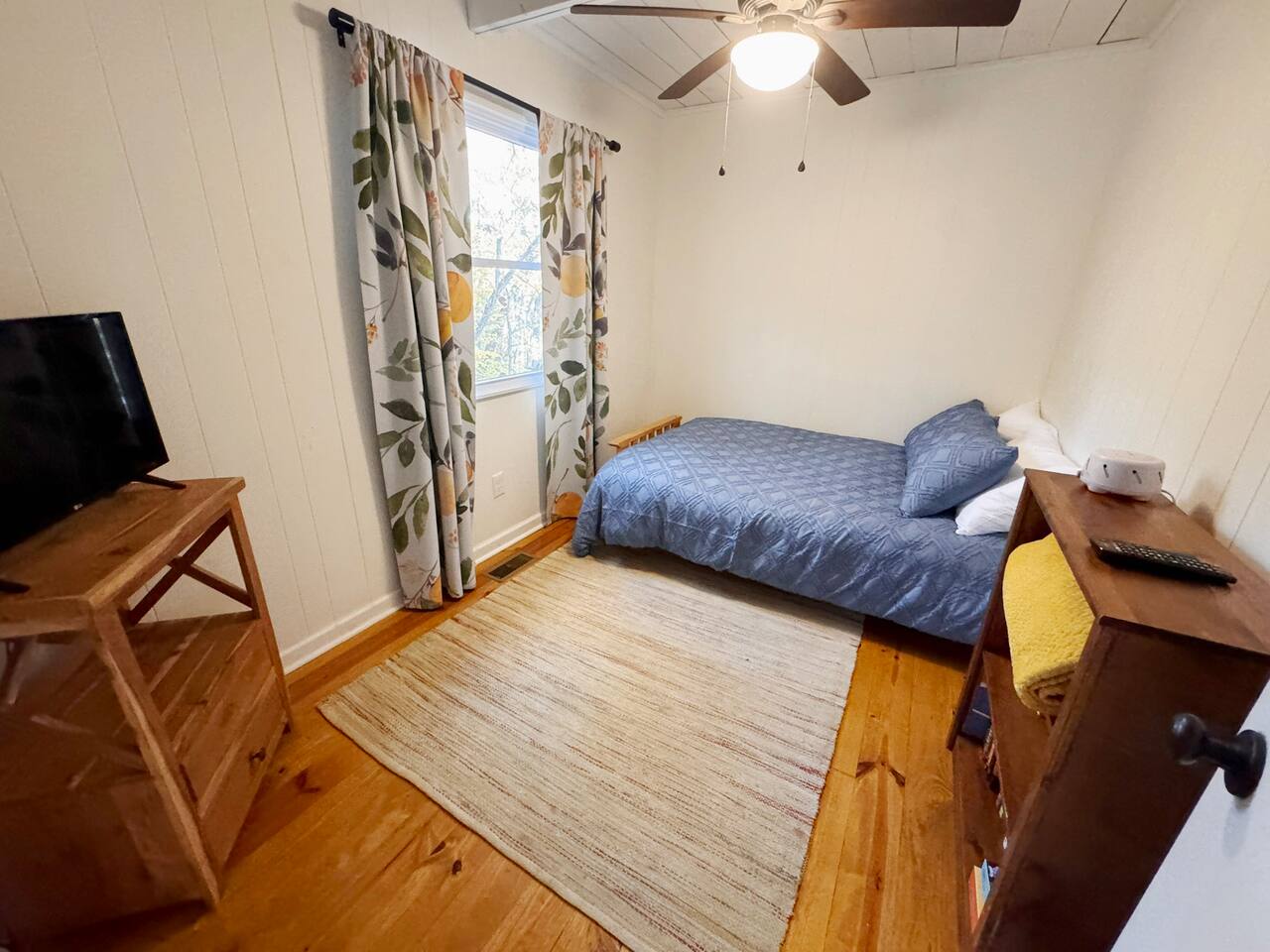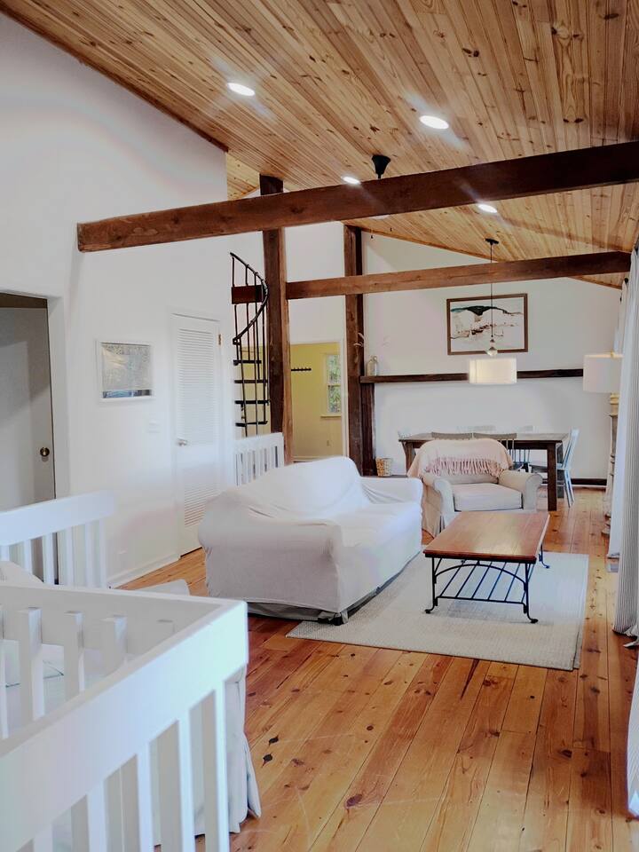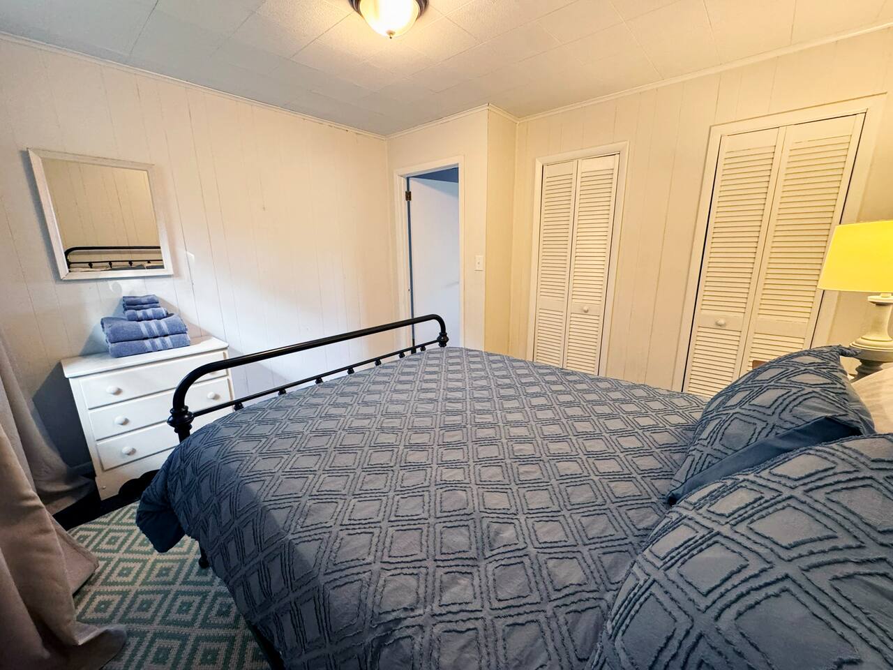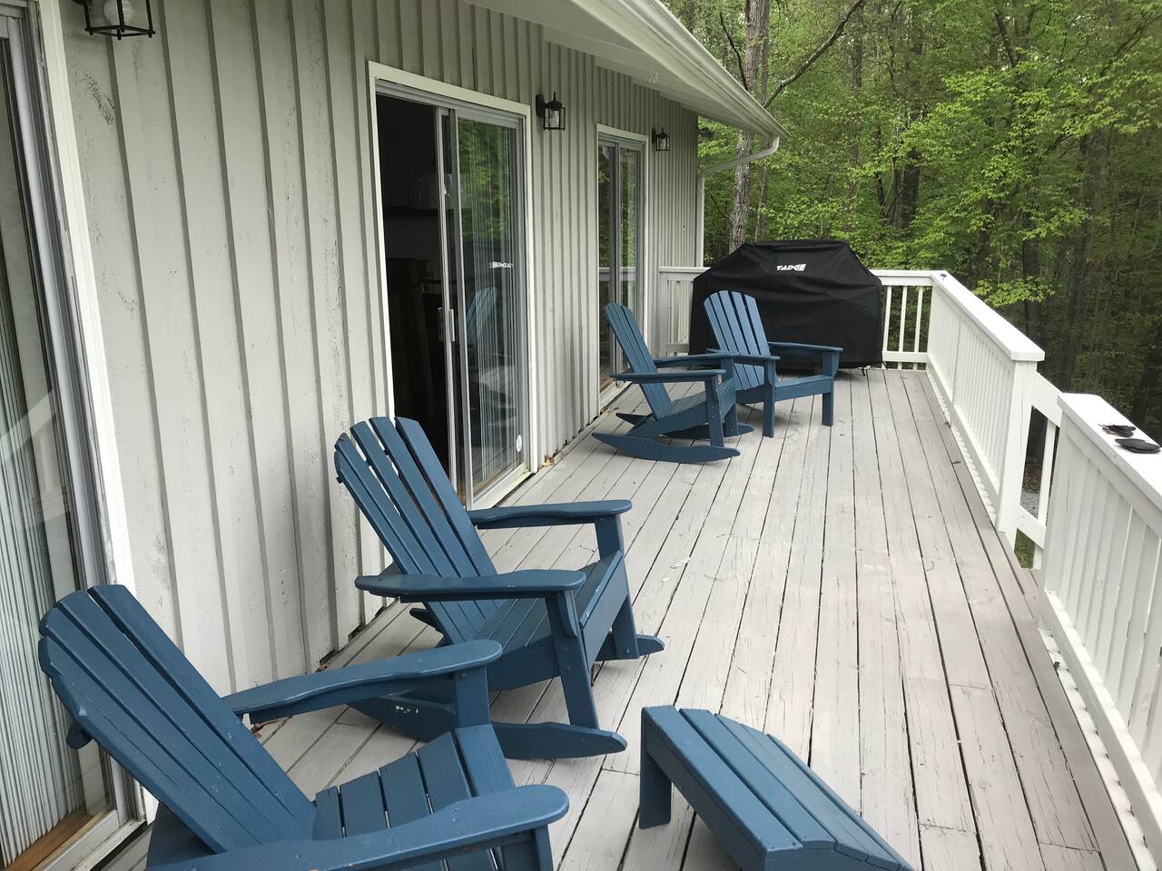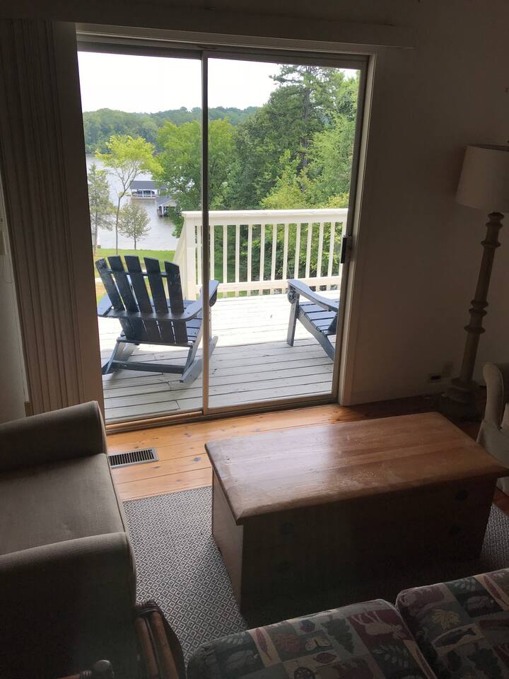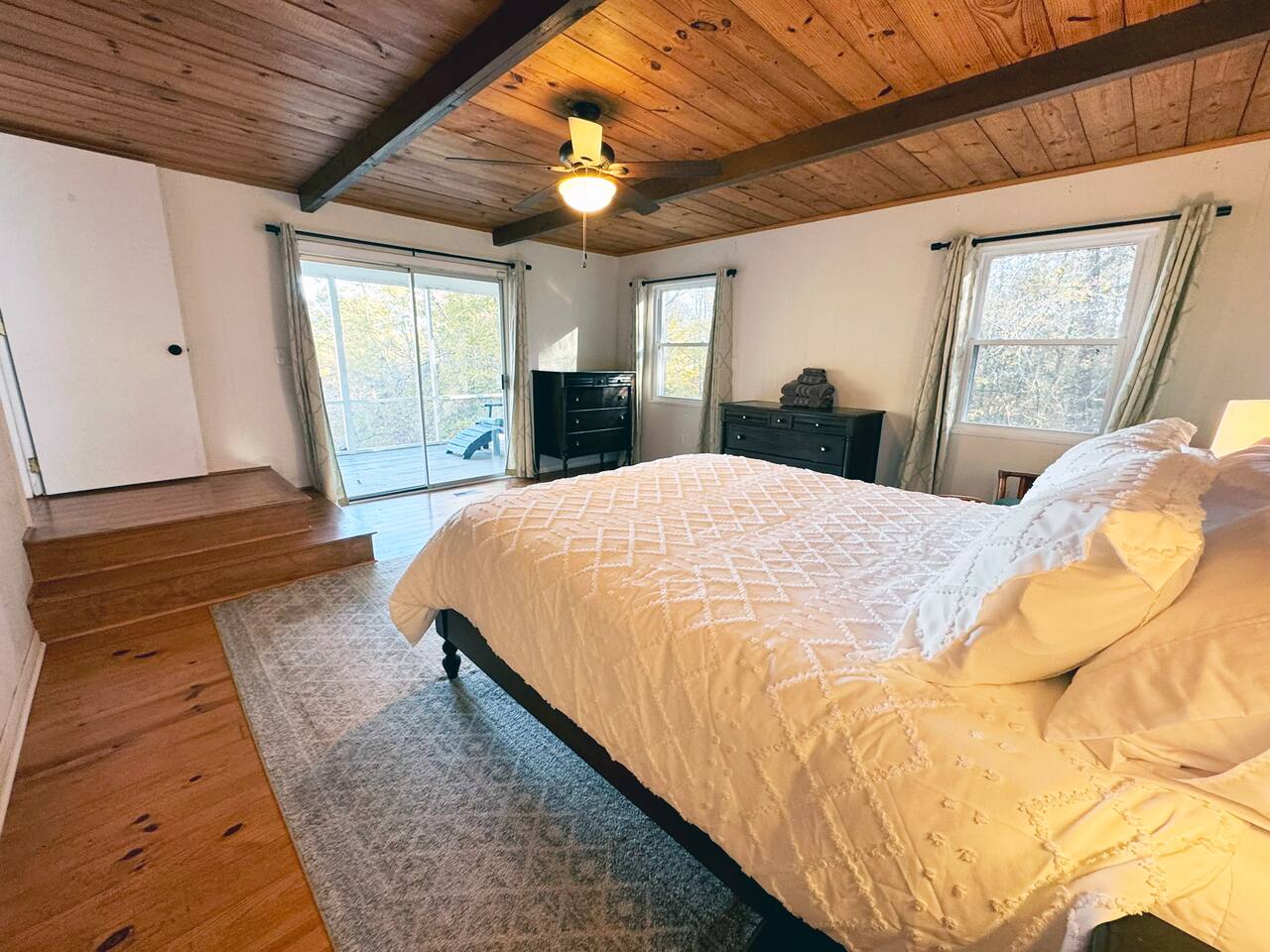 Feel at home with high ceilings and open kitchen/dining/living space overlooking beautiful views of the water. The home has a large master suite with queen bed, a guest room with queen bed next to the main bathroom and an additional room with a futon that can pull out into a bed. A spiral staircase leads to a loft space with three twin beds and extra mattresses if needed. Take in the view from Adirondacks on the deck or sit in the shade of a screened-in porch off the master bedroom. NEW! Water Filter installed in December 2020, with crystal clean water and smell!