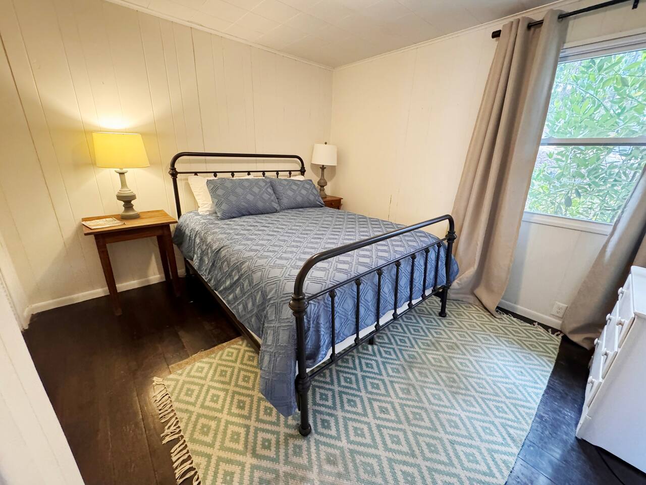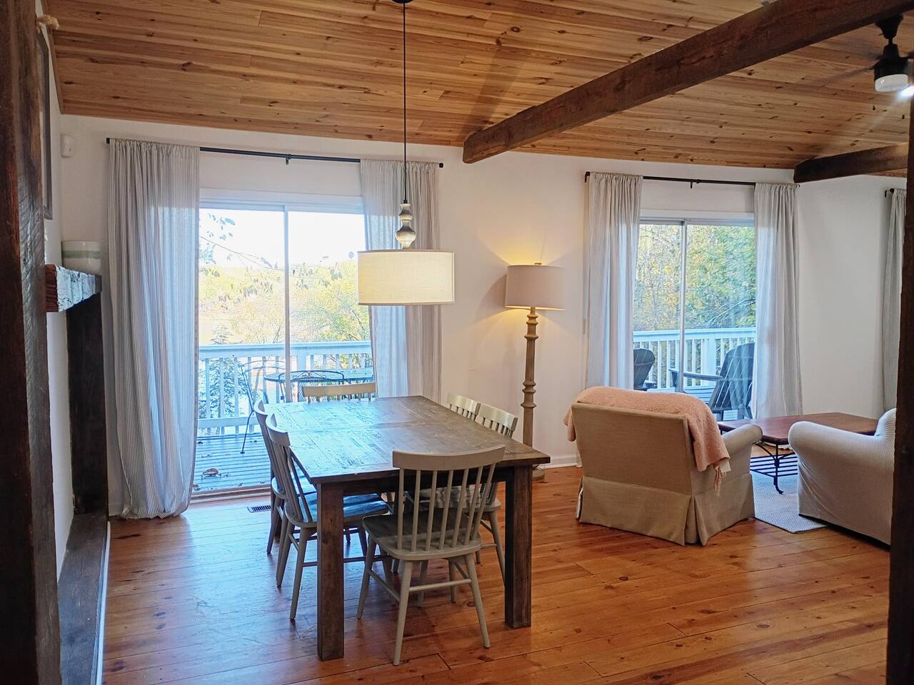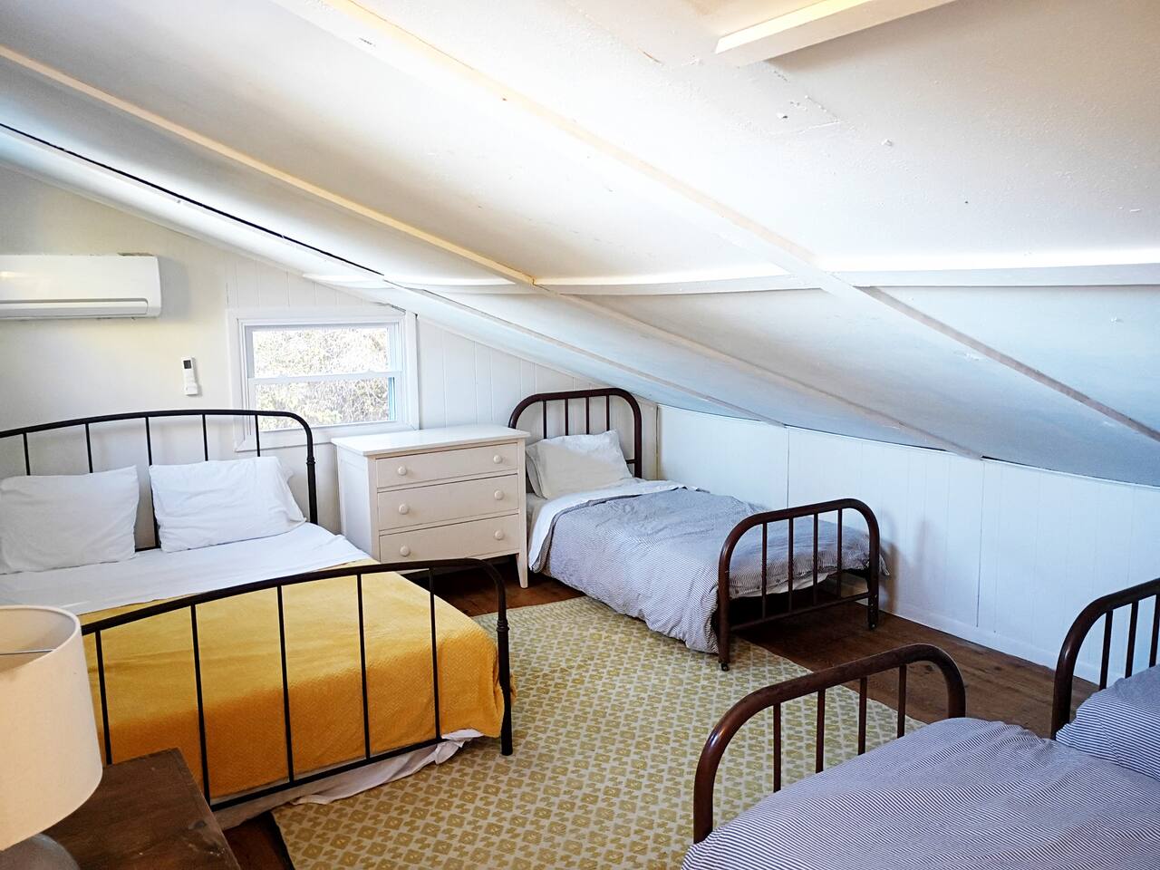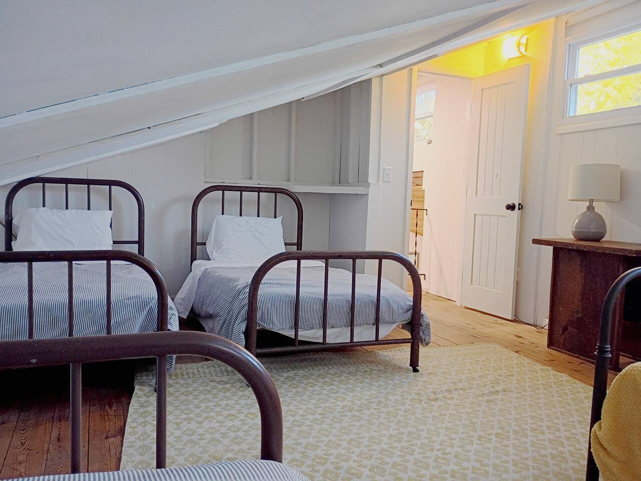 Feel at home with high ceilings and open kitchen/dining/living space overlooking beautiful views of the water. The home has a large master suite with queen bed, a guest room with queen bed next to the main bathroom and an additional room with a futon that can pull out into a bed. A spiral staircase leads to a loft space with three twin beds and extra mattresses if needed. Take in the view from Adirondacks on the deck or sit in the shade of a screened-in porch off the master bedroom. NEW! Water Filter installed in December 2020, with crystal clean water and smell!