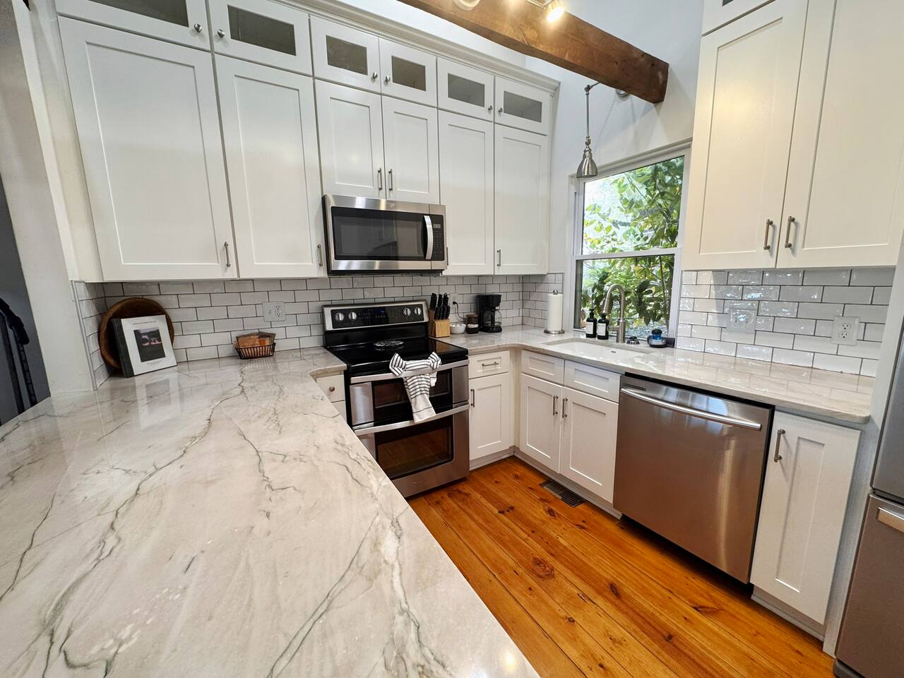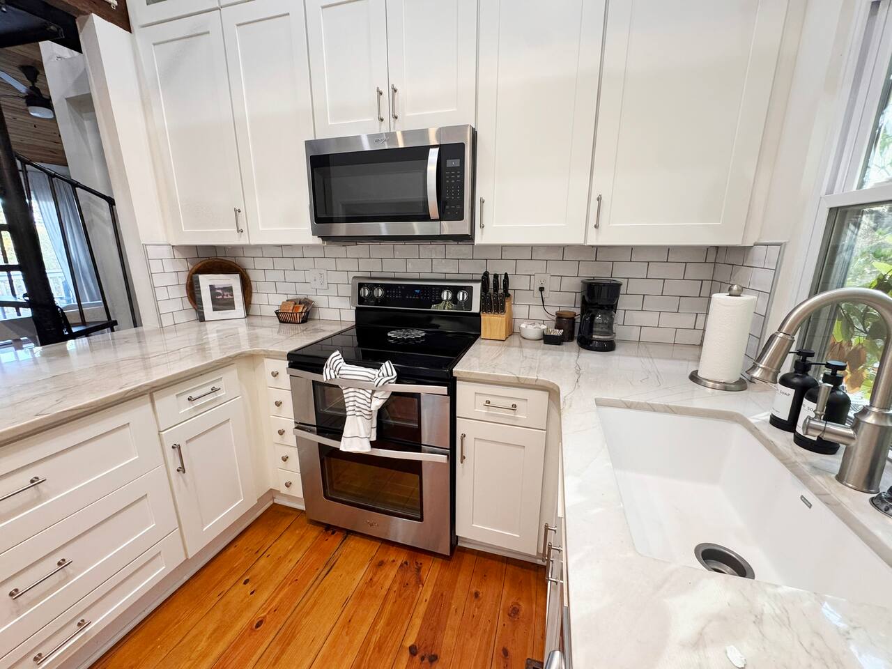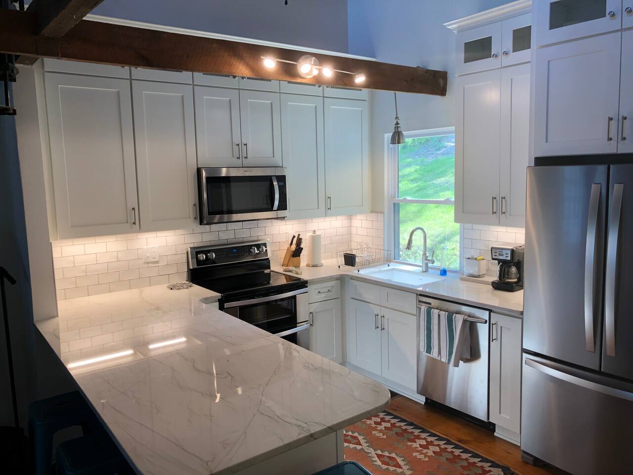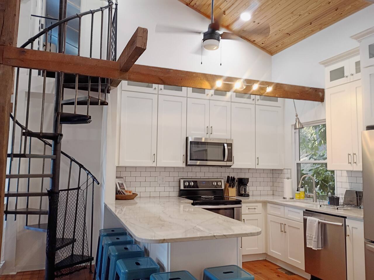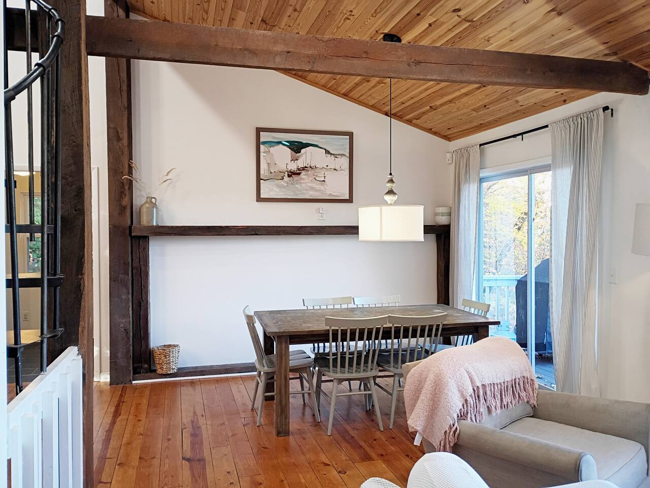 Feel at home with high ceilings and open kitchen/dining/living space overlooking beautiful views of the water. The home has a large master suite with queen bed, a guest room with queen bed next to the main bathroom and an additional room with a futon that can pull out into a bed. A spiral staircase leads to a loft space with three twin beds and extra mattresses if needed. Take in the view from Adirondacks on the deck or sit in the shade of a screened-in porch off the master bedroom. NEW! Water Filter installed in December 2020, with crystal clean water and smell!